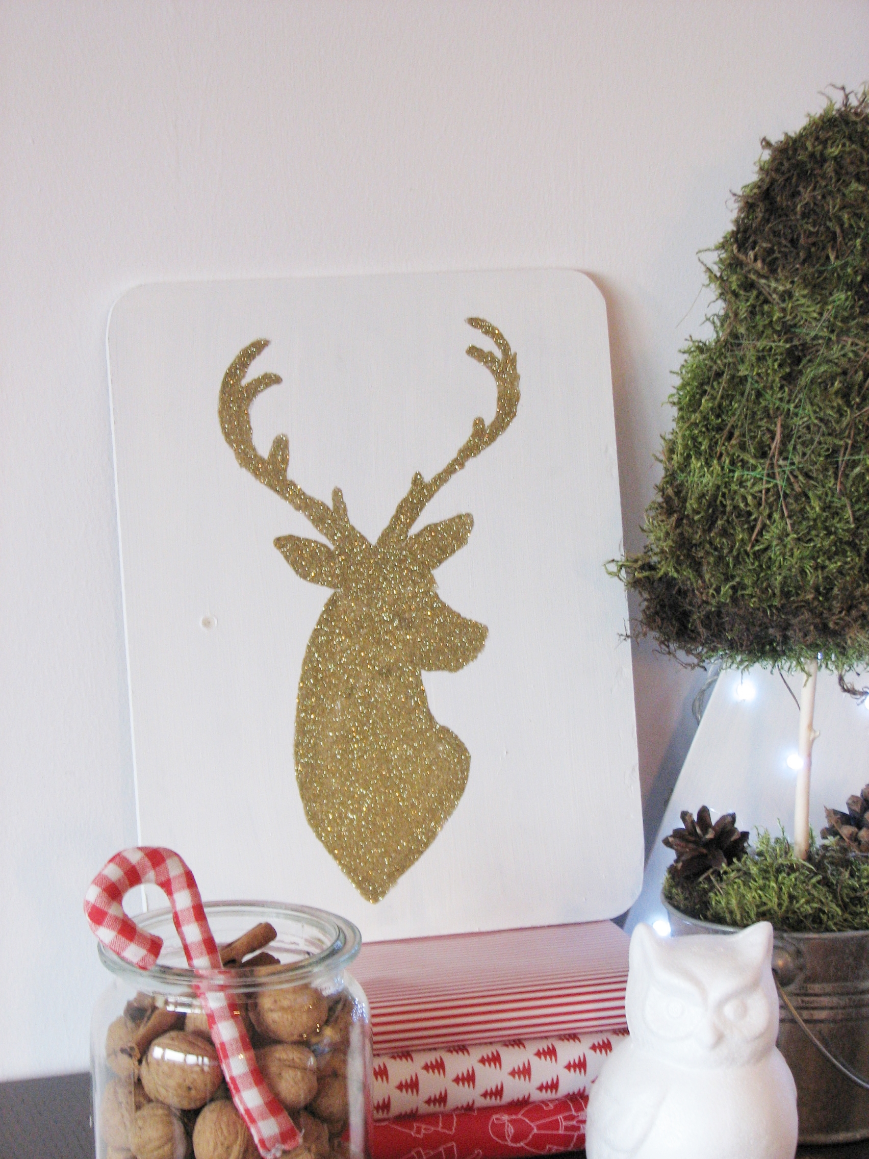 Pokażę Wam jak zrobiłam obrazek renifera. Nie obyło się bez brokatu, bo ja uwielbiam jak się wszystko błyszczy na święta. Deska, której użyłam