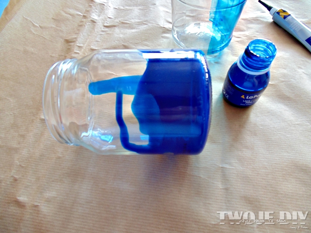 Do środka słoika wlej farbę i rozprowadź po ściankach. Odwróć do góry nogami, aby nadmiar farby wypłynął.