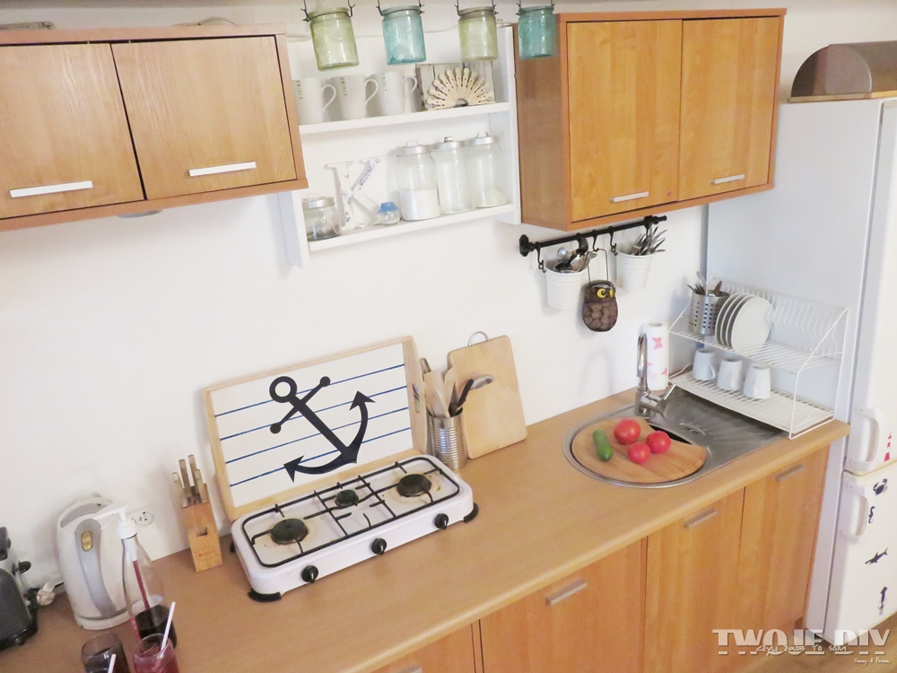Biała półka między meblami kuchennymi też jest mojej roboty.
