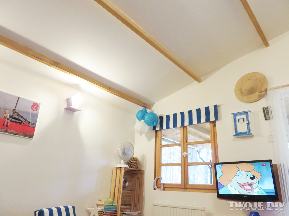 Sufit jest niesamowity. Zostawienie belek na zewnątrz to był strzał w dziesiątkę. Trzy papierowe lampiony podwieszone pod belką, skutecznie maskują puszkę elektryczną. Kapelusz natomiast zasłania korki elektryczne.