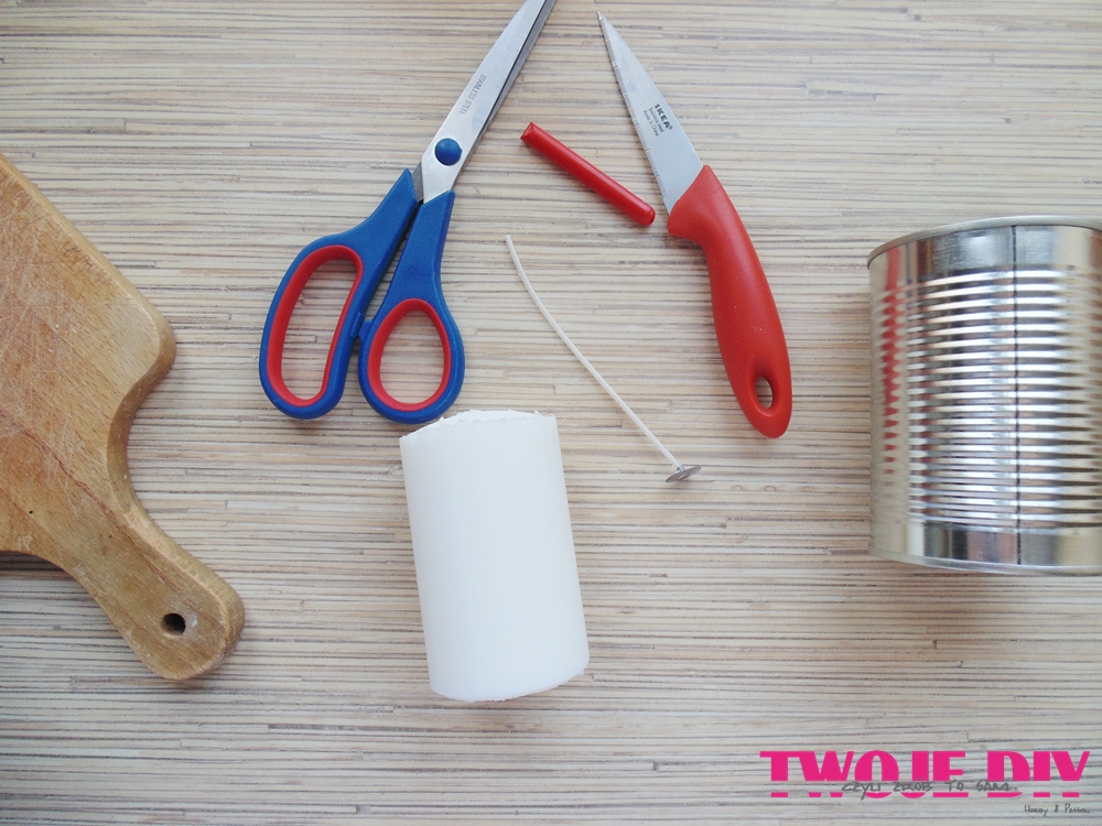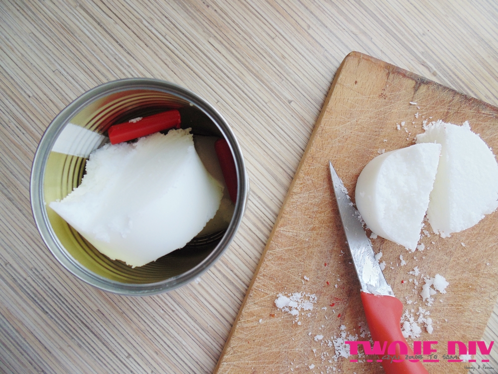 Na początek kroimy wosk na mniejsze kawałki i razem ze świeczką wrzucamy do puszki. Puszkę wstawiamy do garnka (robimy kąpiel wodną) i czekamy, aż wosk, kredka rozpuszczą się.
