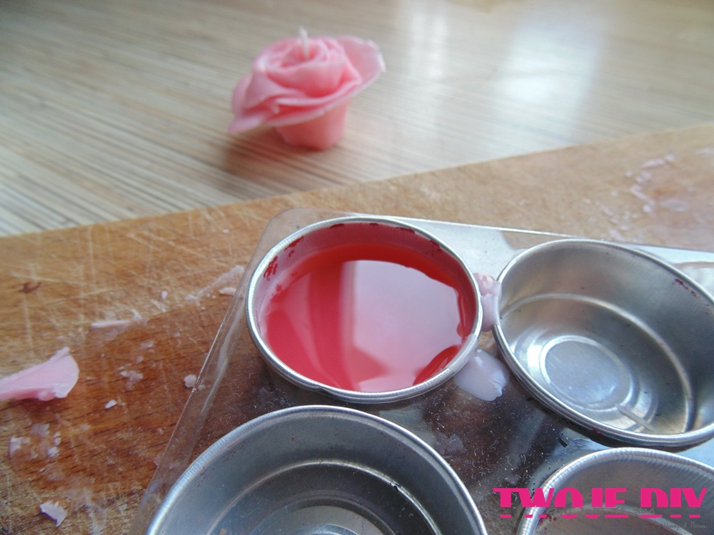 Do pustego wkładu tealight wlewamy 1/2 wosku.