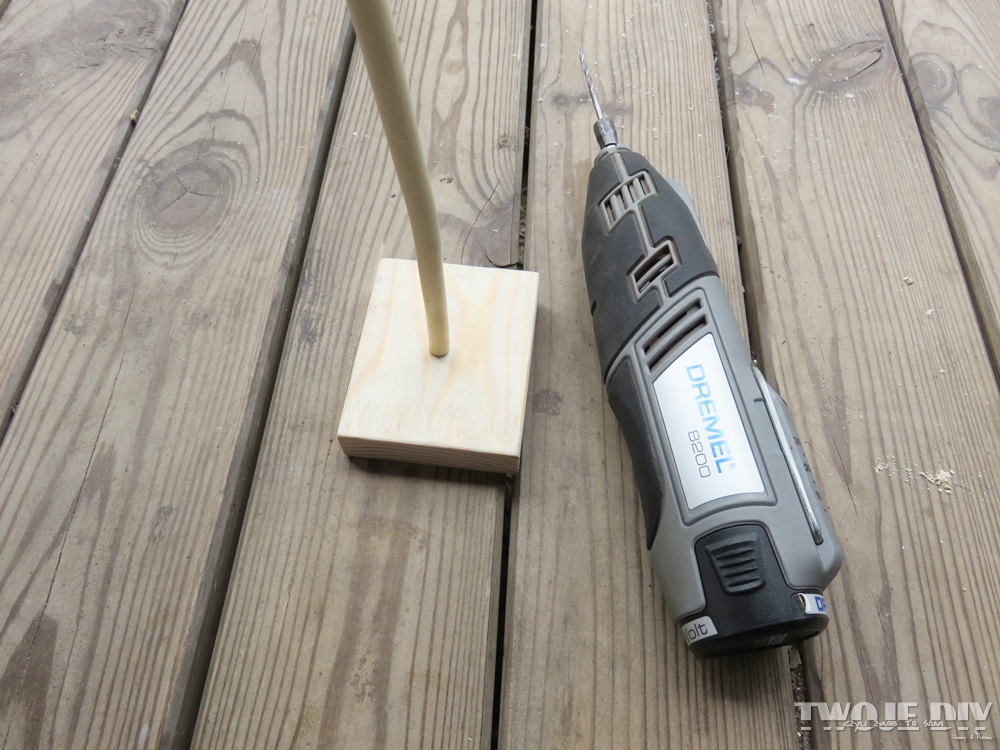 Wiertarką robię dziurkę. Mój kijek włożyłam na wcisk i trzema się idealnie. Kijek to młody pęd wierzby, obrany z kory i wysuszony.