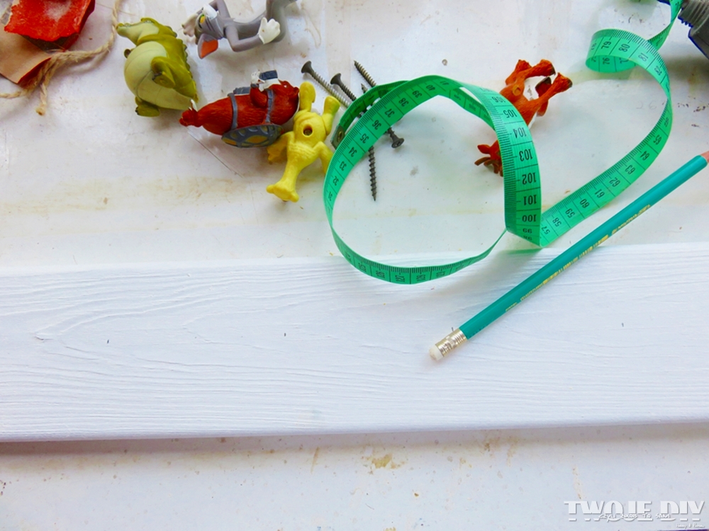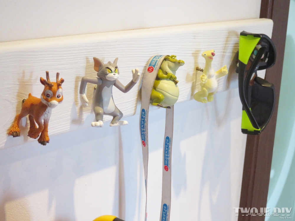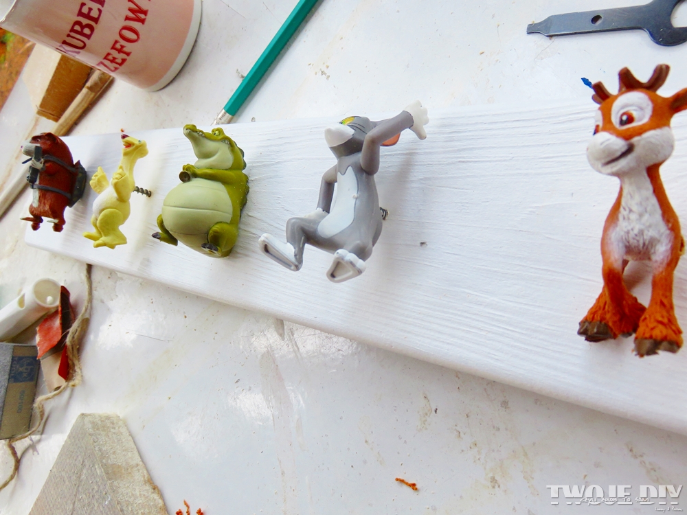 Ja zrobiłam mały błąd, bo użyłam za długich wkrętów. Takie miałam akurat pod ręką. Jednak Wam proponuję użyć krótszych. Wtedy zabawki będą bezpośrednio przy desce. Dzieciakom na pewno będzie podobał się taki wieszak z postaciami z ulubionych bajek.