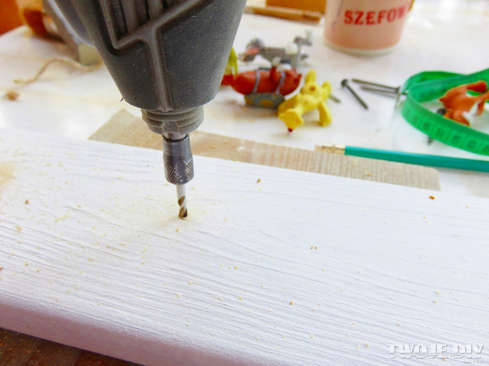 Małym wiertłem przewiercamy deskę pod wkręty.